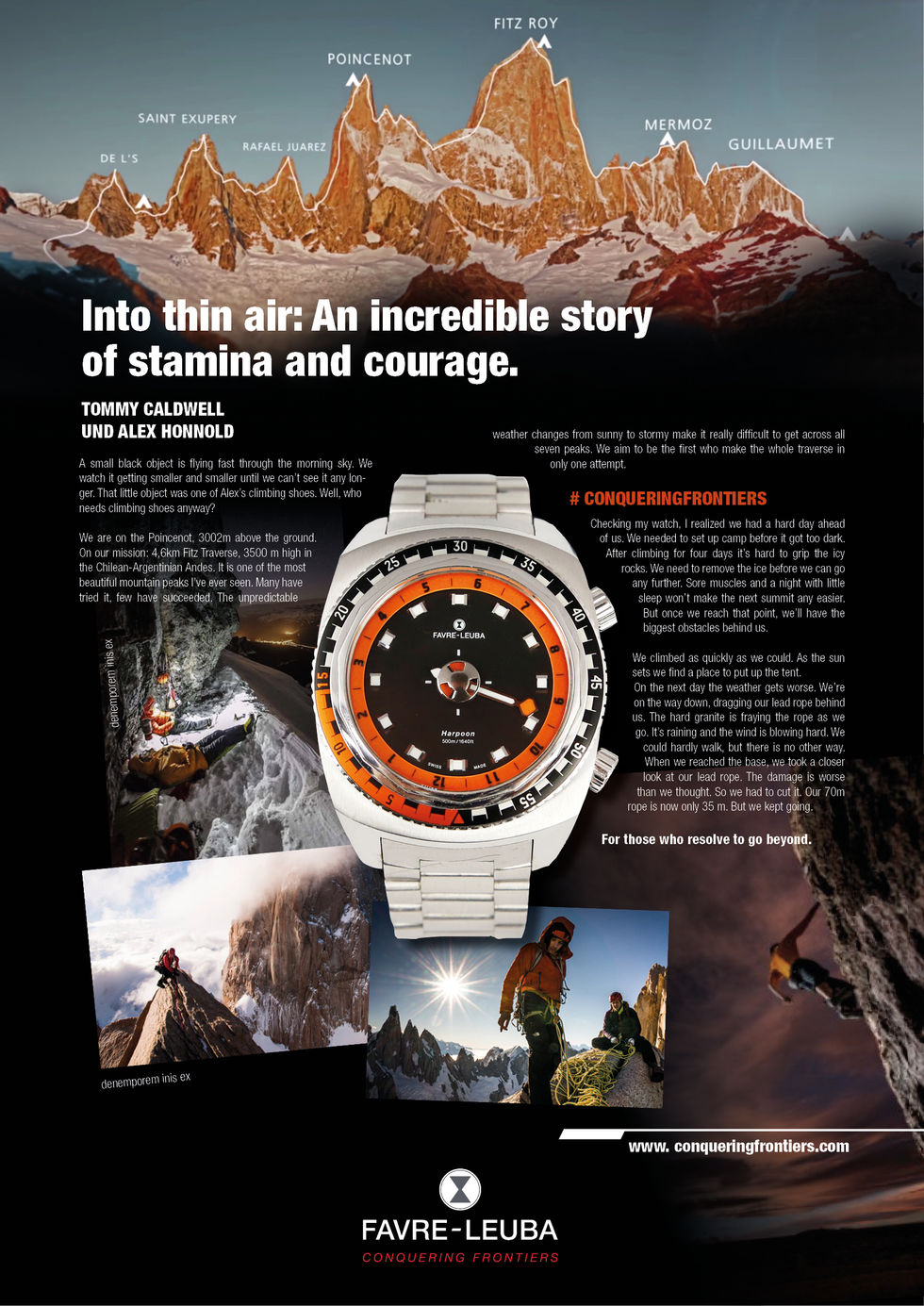 Mit der neuen Kampagne unter dem Motto «Conquering Frontiers» wollen wir Favre-Leuba als den idealen Begleiter für alle positionieren, die sich neuen Herausforderungen stellen und stetig ihre eigenen Grenzen erweitern. Prominente Markenbotschafter wie die renommierten Bergsteiger Tommy Caldwell und Alex Honnold werden unsere Kampagne unterstützen. Ihre faszinierenden Geschichten werden unter anderem in einer ausführlichen Longcopy-Anzeige präsentiert.